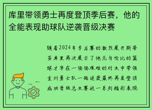 库里带领勇士再度登顶季后赛,他的全能表现助球队逆袭晋级决赛