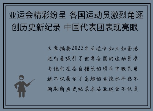 亚运会精彩纷呈 各国运动员激烈角逐 创历史新纪录 中国代表团表现亮眼