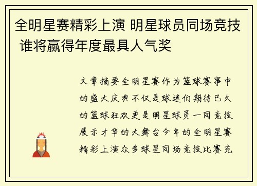 全明星赛精彩上演 明星球员同场竞技 谁将赢得年度最具人气奖